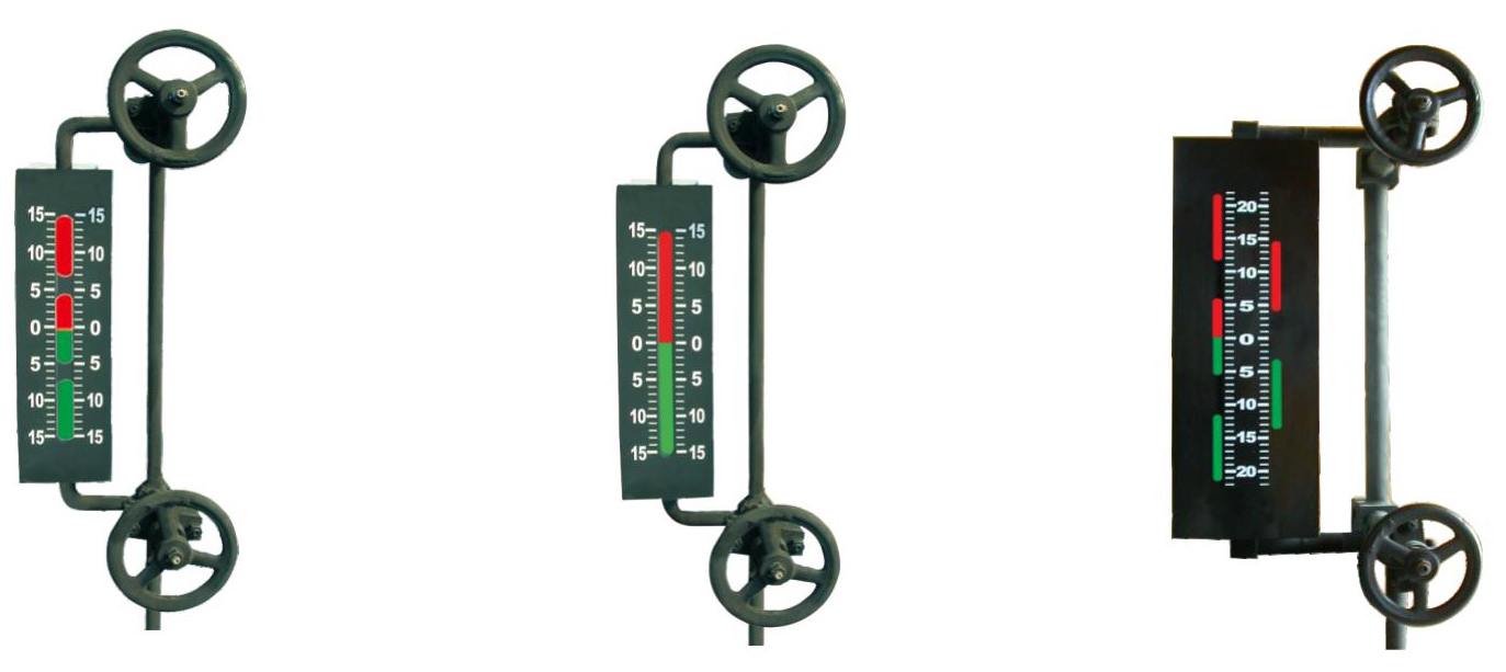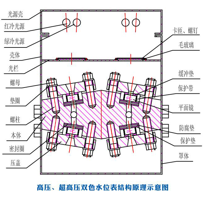 五窗、七窗、九窗水位表觀察孔在表體的兩條直線上,通過(guò)將觀測(cè)孔交錯(cuò)組合消除了中間盲區(qū)。由光源發(fā)出的光通過(guò)紅、綠濾色鏡片,射向水位表體液腔,在表面內(nèi)汽相部分,紅光射向正前方,而綠光斜射到壁上被吸收。而在表體內(nèi)液相部分,由于水的折射使綠光射向正前方,而紅光斜射到壁上被吸收。因此在正前方觀測(cè)將獲得汽紅、水綠、汽滿全紅、水滿全綠的顯示效果。