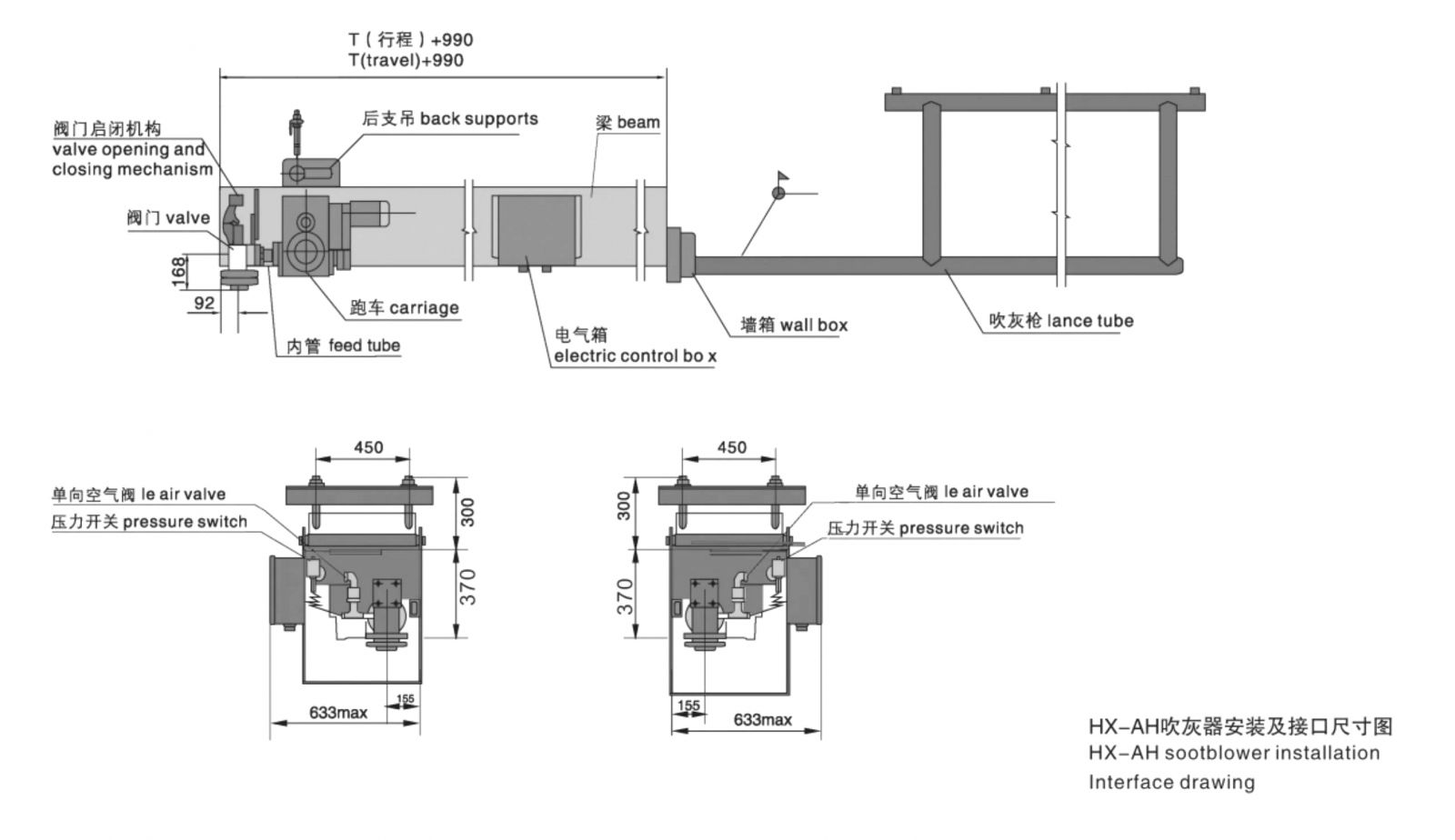 HX-AH型吹灰器主要由跑車、提升閥、梁體、墻箱、內(nèi)管、吹灰槍與噴嘴、電氣箱與控制等組成。